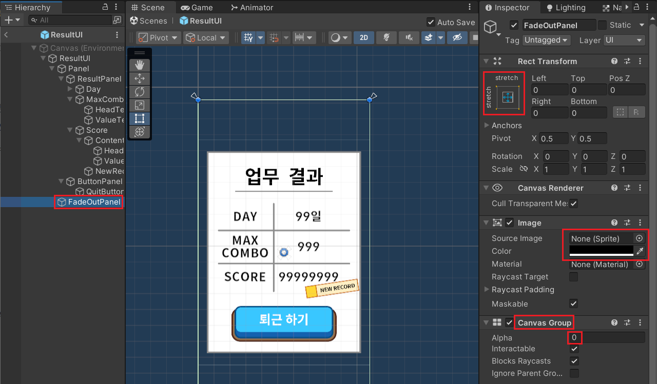 --> ResutlUI에 새로 Panel을 만든 뒤, 퇴근하기 버튼을 누르면 CanvasGroup의 Alpha가 1이 되도록 코드 작성
