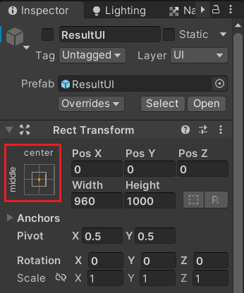 --> 알고보니 아래 사진과 같이 ResultUI의 부모 Canvas인 PopupUICanvas에서 ResultUI가 stretch로 설정되어 있지 않았다.