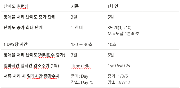 - 서류 처리 시 일과시간 증감수치 : 난이도에 따라 조정 (감소는 3 / 7 / 12, 증가는 1 / 3 / 5)