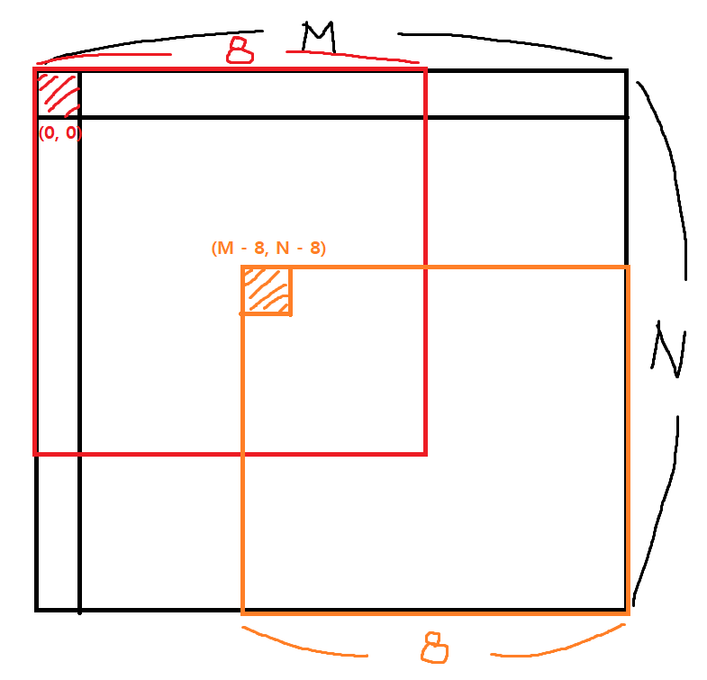 : 8×8 크기의 체스판에서 맨 왼쪽 위 칸을 기준으로 삼을 때, 기준칸이 될 수 있는 좌표는 아래 그림과 같이 (0, 0)에서부터 (M - 8, N - 8)까지이다.