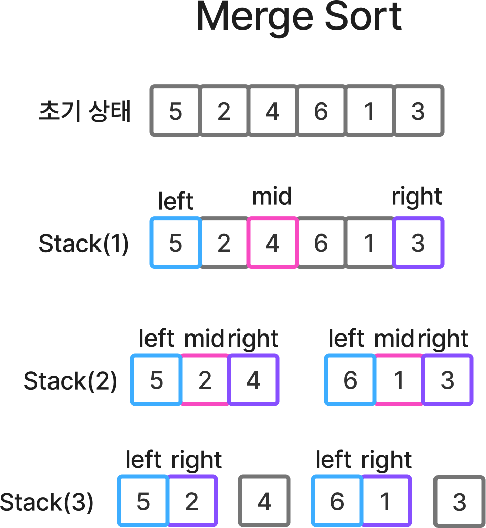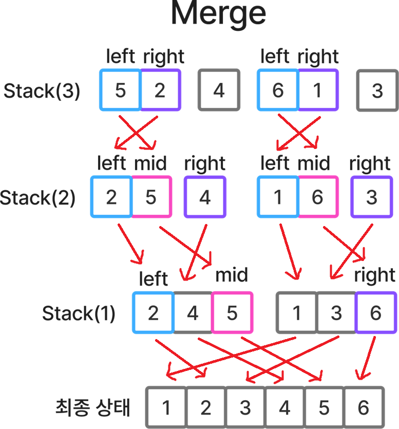 Merge(arr, left, mid, right); // 정렬된 두 부분 병합