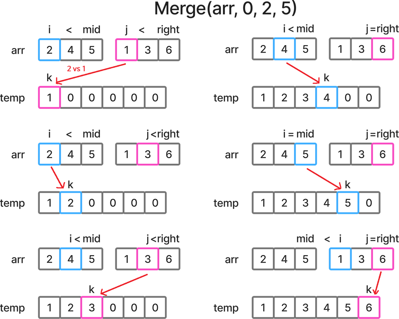 while (i <= mid && j <= right) // 왼쪽과 오른쪽의 각 index가 끝을 넘을 때까지 반복