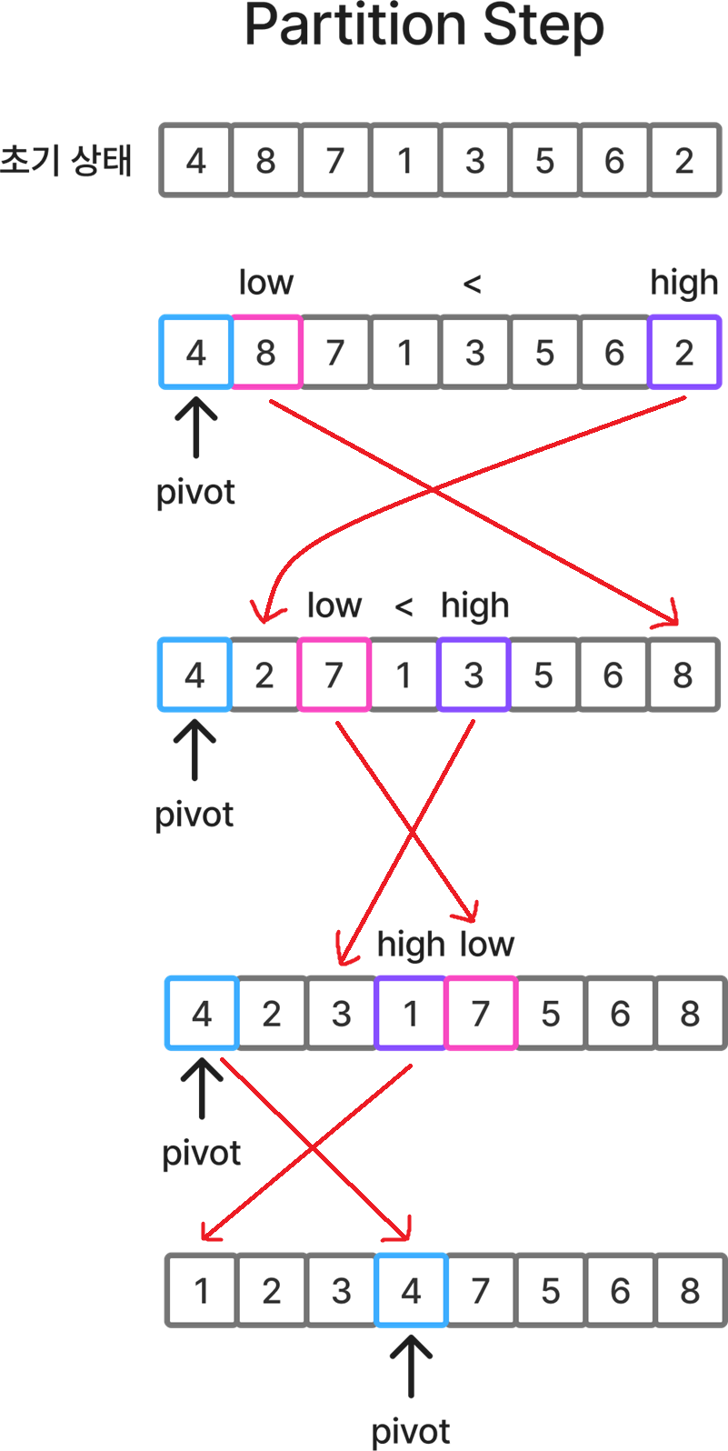 - 피벗보다 작은 것을 앞으로 빼내고 그 뒤에 피벗을 옮겨 피벗보다 작은 것, 큰 것으로 나눈다. --> 이를 'partition step'이라 한다.