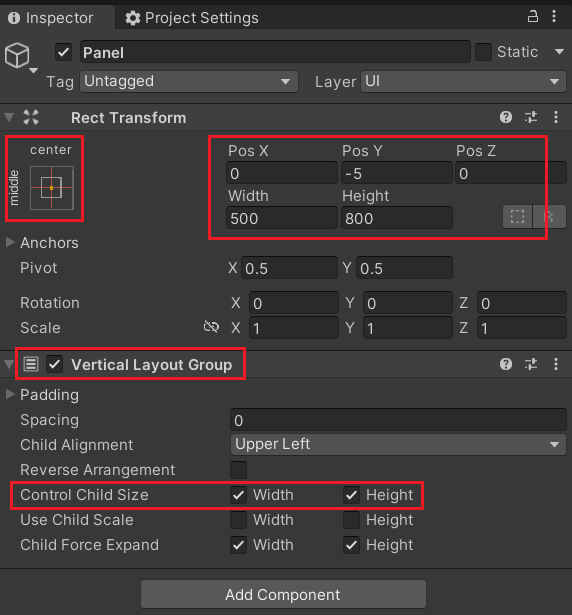 6. canvas 안에 panel 만들고 Inspector에 Image 삭제, Canvas Renderer 삭제, vertical layout group 추가해서 Control Child Size를 Width, Height 둘다 체크 / Anchor 가운데꺼, width 500, height 800, PosY -5 세팅