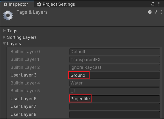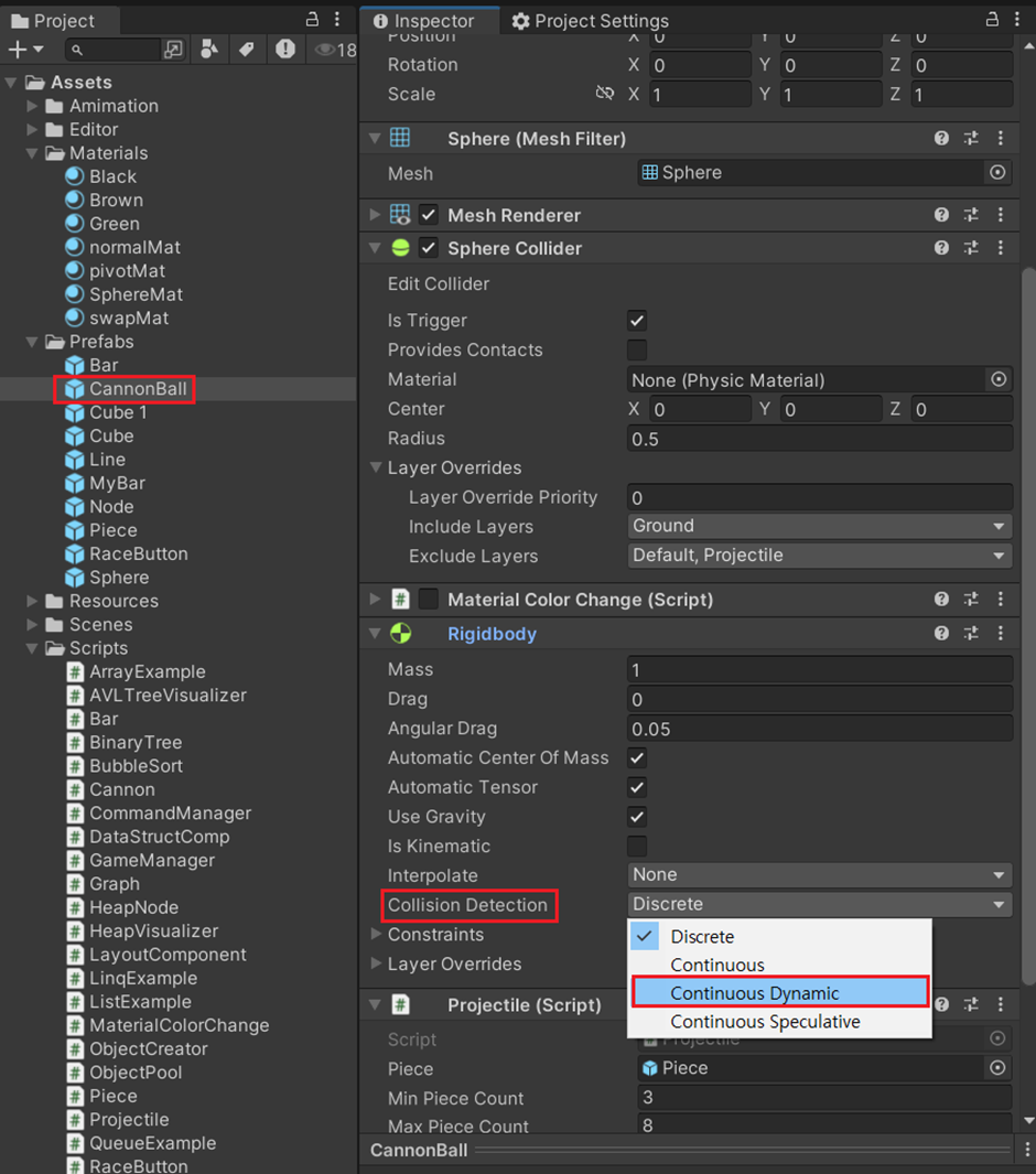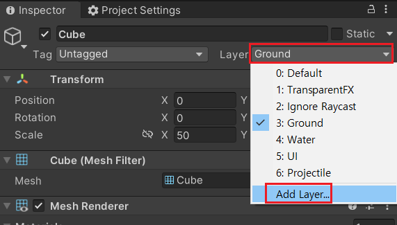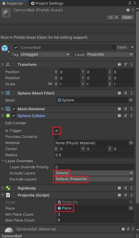 >> Cube는 Ground, CannonBall Prefab은 Projectile로 Layer 설정