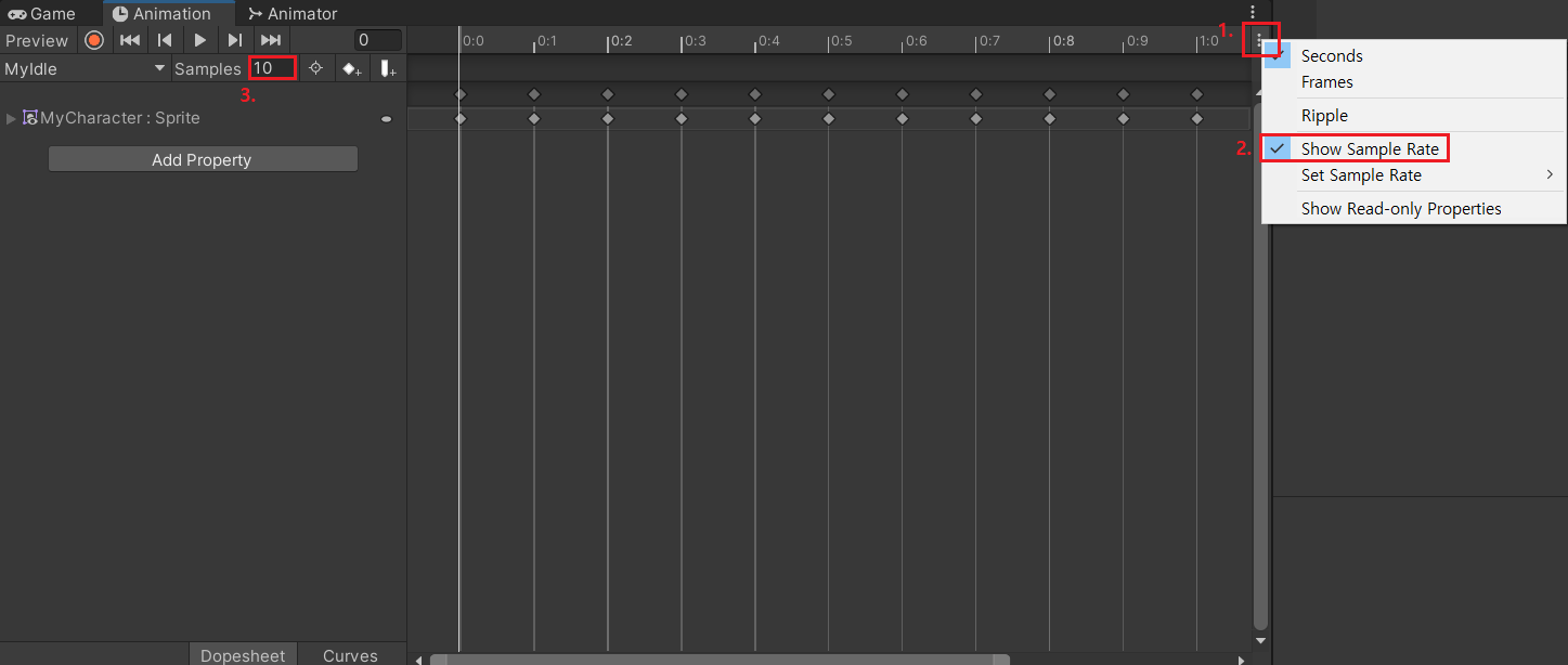 : Show Sample Rate를 켜서 1초당 재생할 Animation 프레임 수를 결정 (10으로 설정)