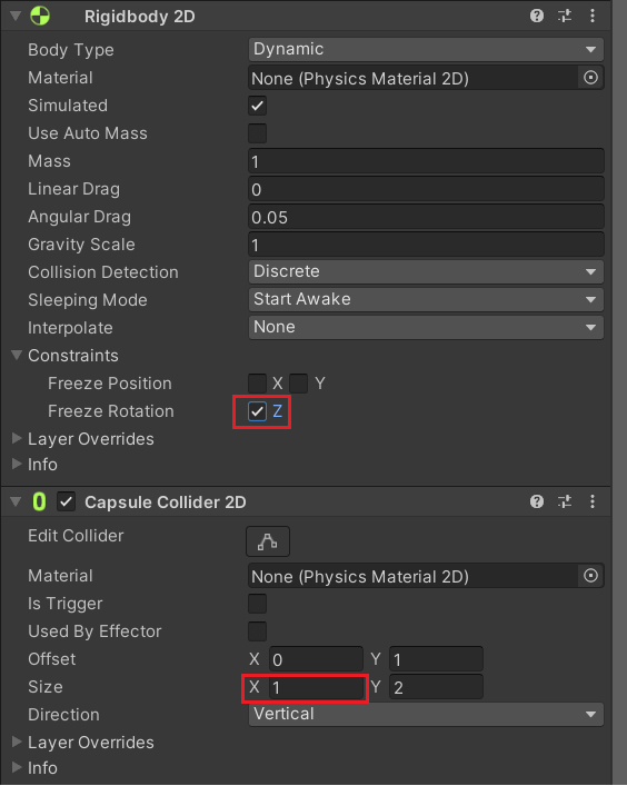 : Freeze Rotation의 Z를 체크해서 앞으로 고꾸라지지 않도록 설정