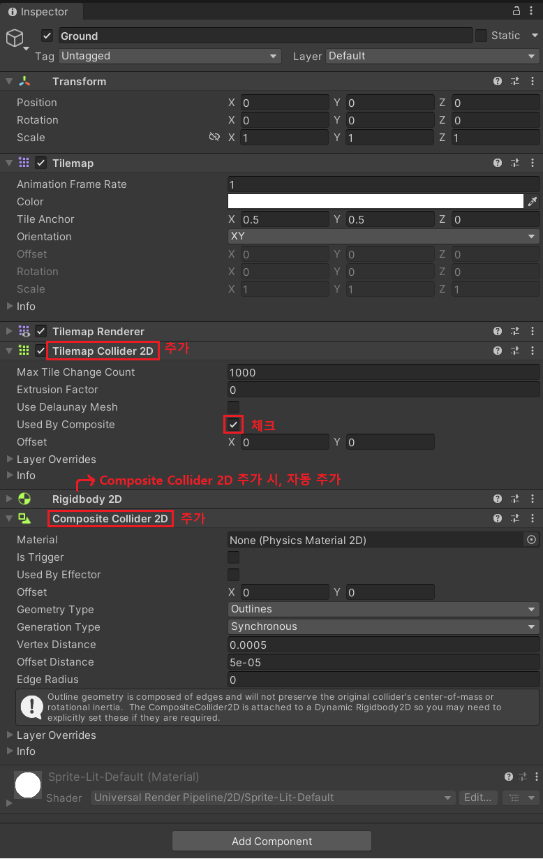>> Character에 Rigidbody 2D와 Capsule Collider 2D 추가