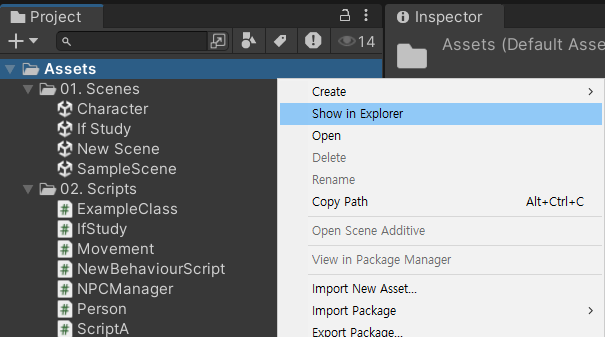 - Project View - Assets폴더 우클릭 - Show in Explorer