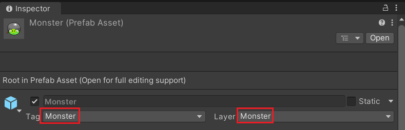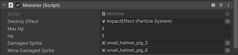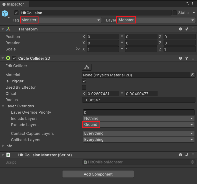 : 몬스터의 자식으로 Object(HitCollision)를 만들고 Circle Collider2D를 넣은 뒤, Exclude Layers에 Ground 추가