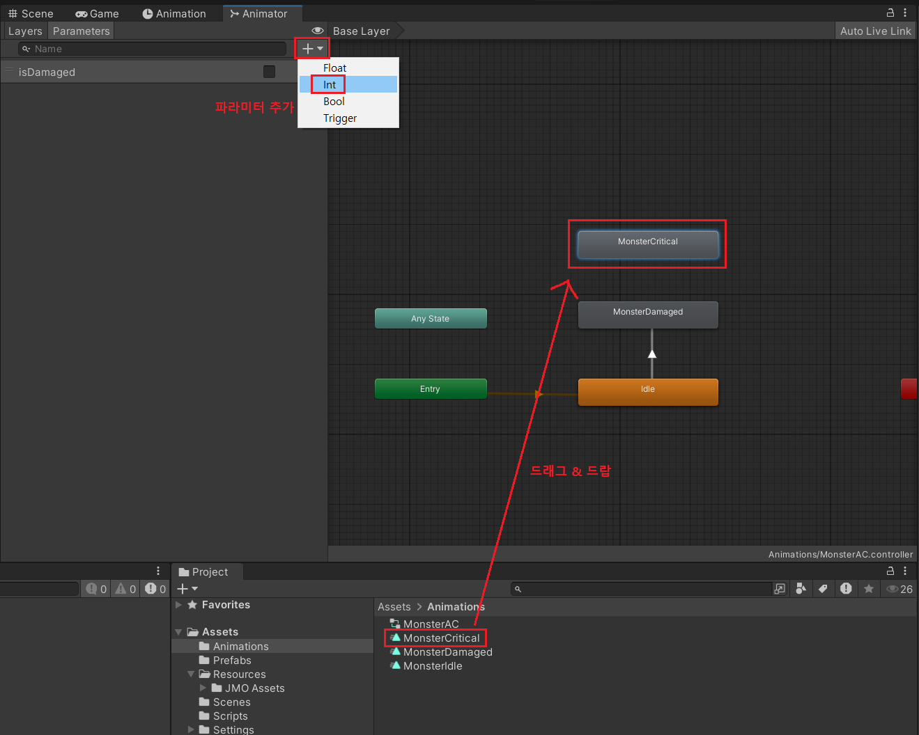animator.SetInteger(IsDamaged, 1); // Animation Parameters 변경