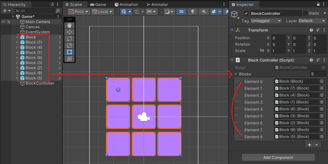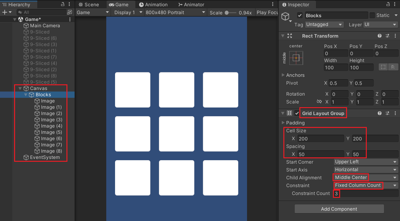 --> Blocks에 Grid Layout Group을 추가한 뒤, 설정해주고 Image를 복붙하면 알아서 배치된다.