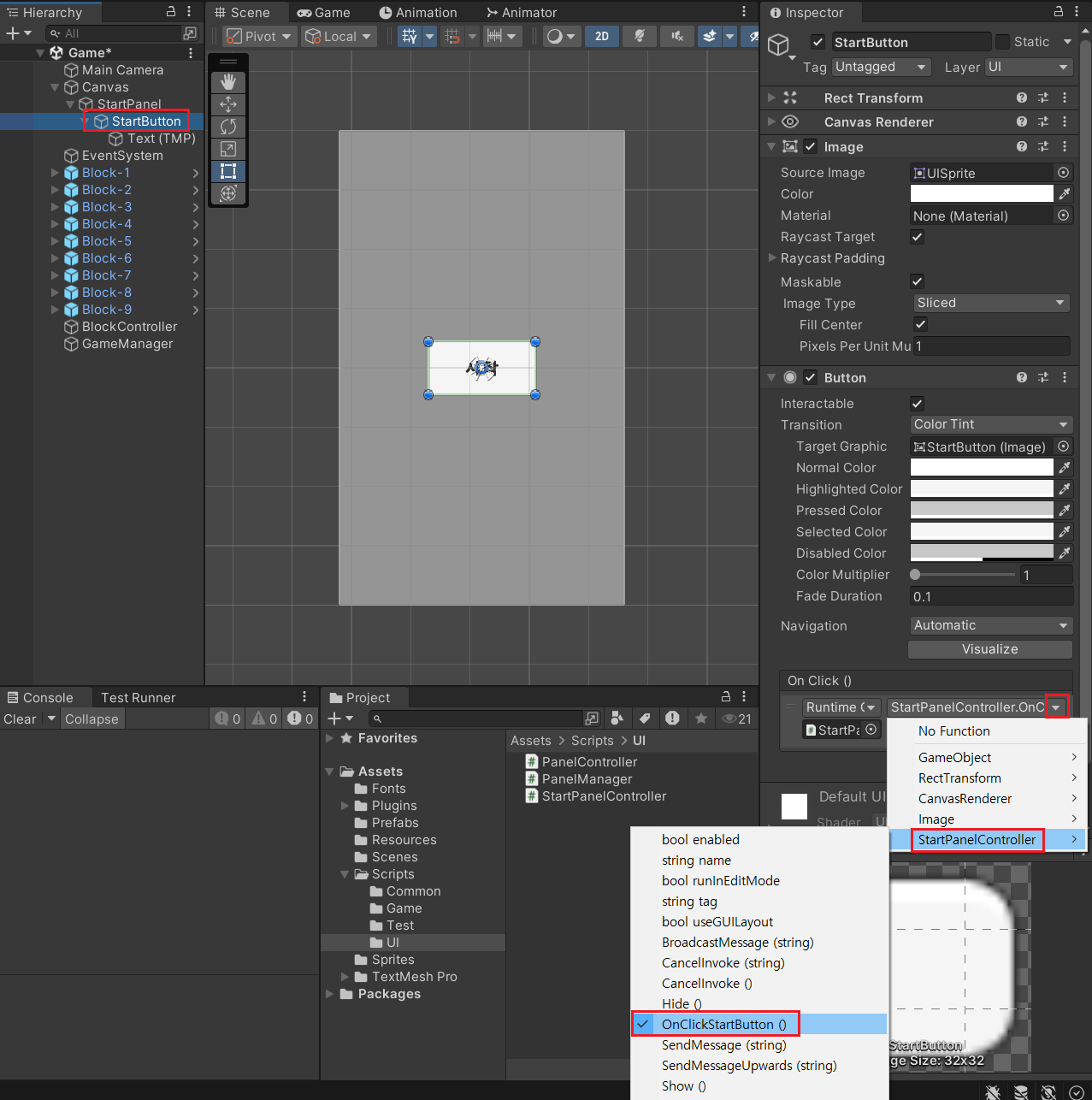 --> 잠깐 테스트를 위해 OnClick()에 GameManager를 바인딩해서 StartGame() 할당