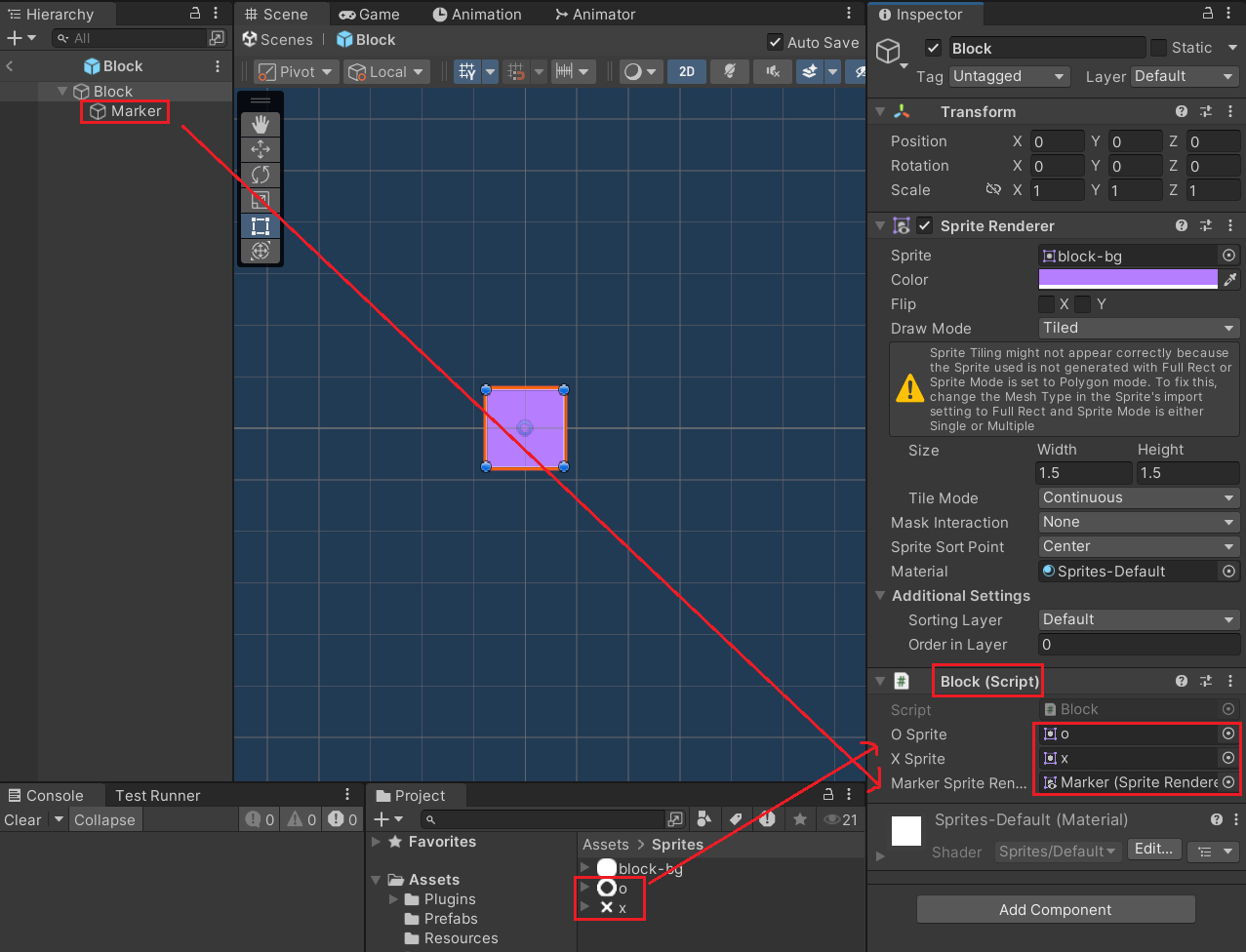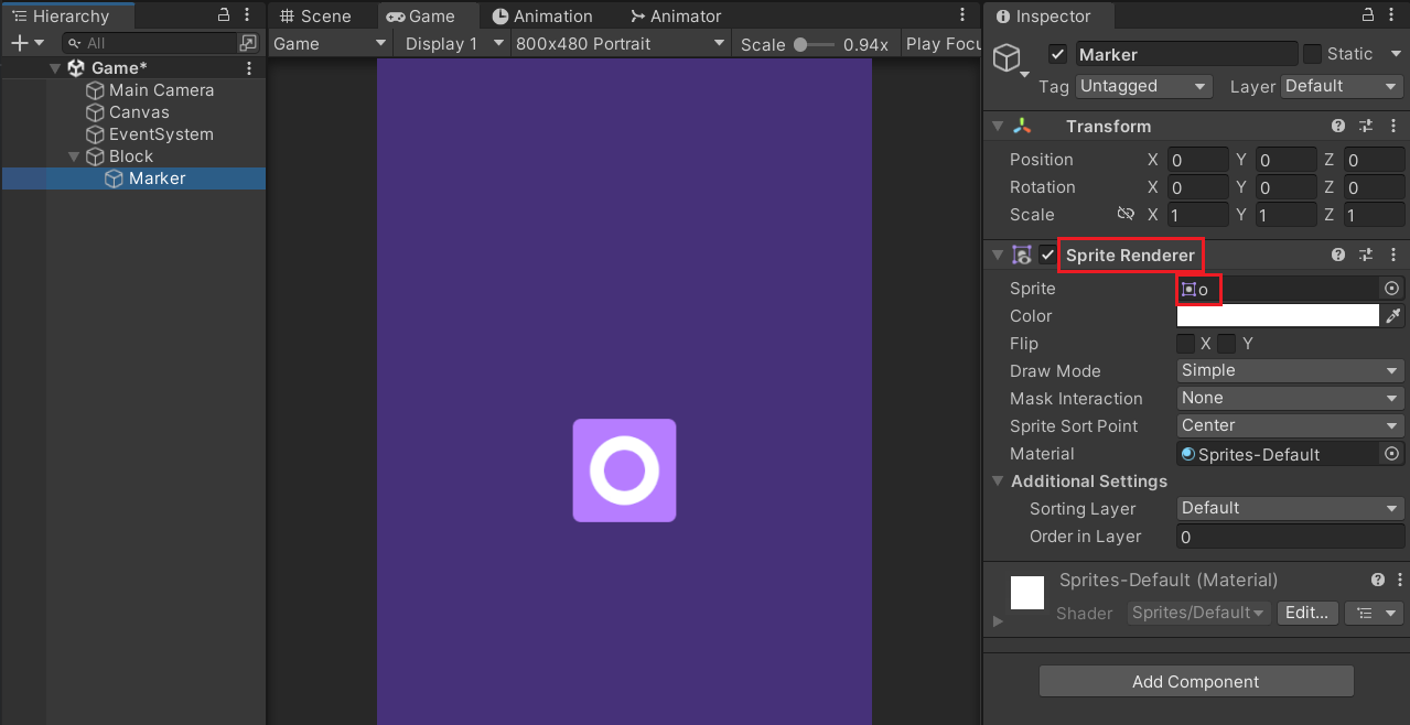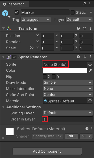 - 빈 게임 오브젝트로 Marker를 만든 후, Sprite Renderer를 추가한 뒤, Order in Layer를 1로 수정