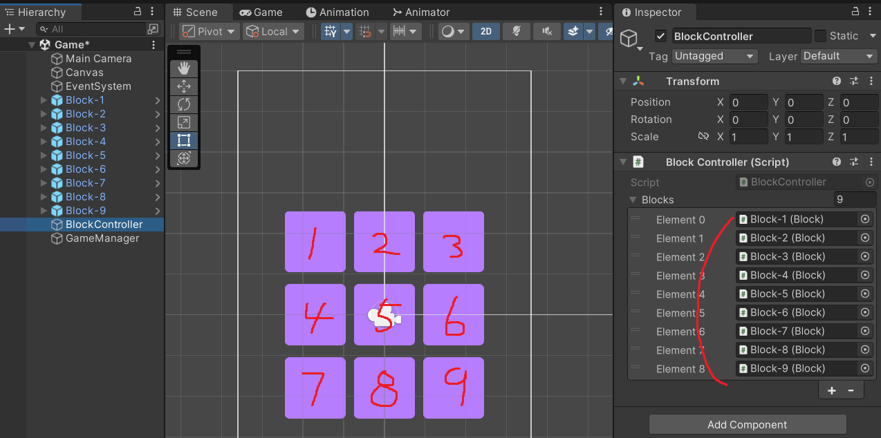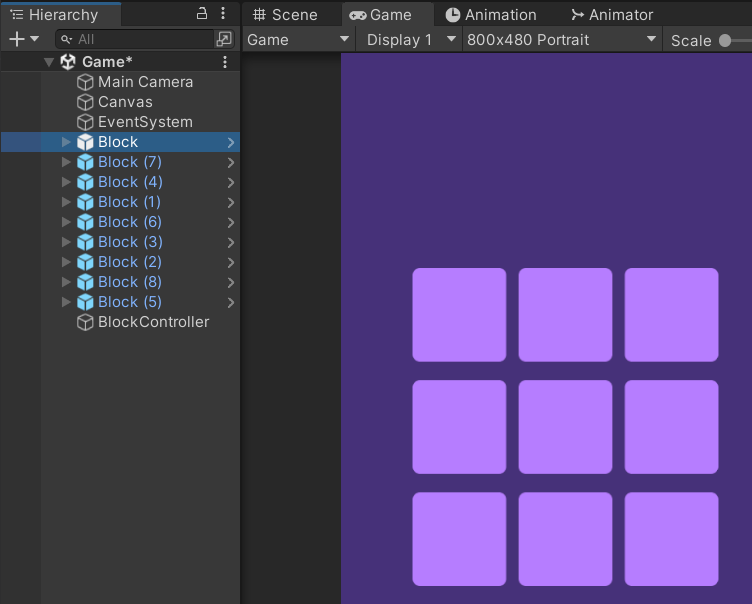 --> X 간격 1.7 / Y 간격 1.8 (Block을 9개 이상으로 계속 생성해야 한다면 Instantiate를 사용했을 것)