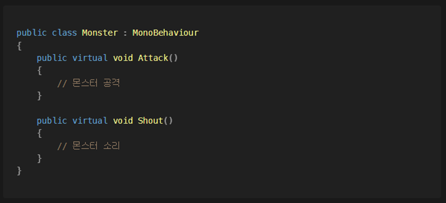 - Virtual : 함수를 선택적으로 재정의 할 수 있는 방법