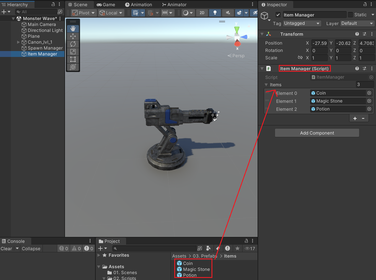 >> 빈 게임 오브젝트로 ItemManager 생성 후, ItemManager.cs 추가 및 바인딩