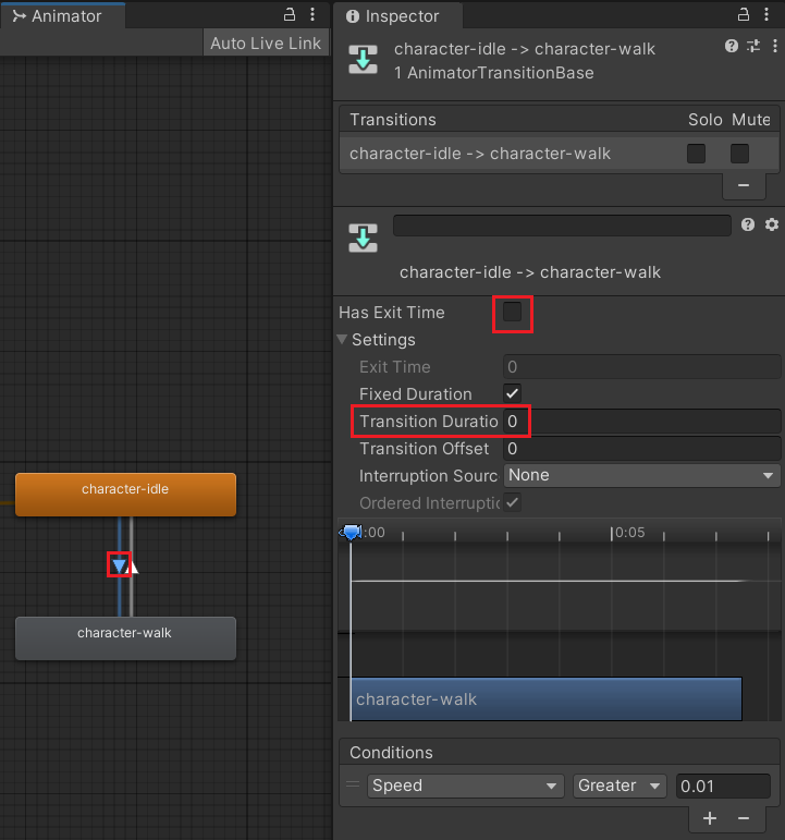 - Has Exit Time : 조건상 전환해야 하지만, 남은 시간만큼 Animation을 재생하고 넘기도록 설정해주는 것 --> 체크 해제