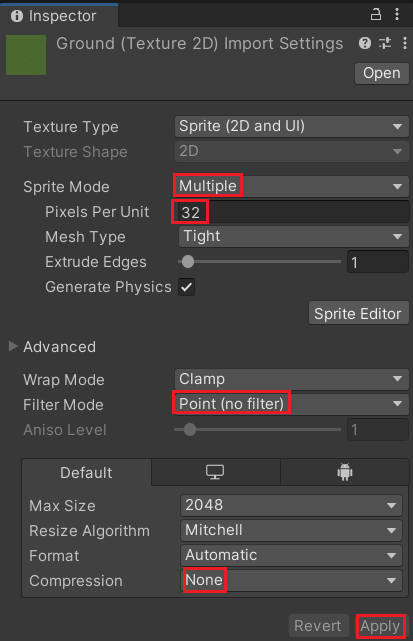 --> altas는 여러 Image가 있기 때문에 Sprite Mode를 Multiple로 설정