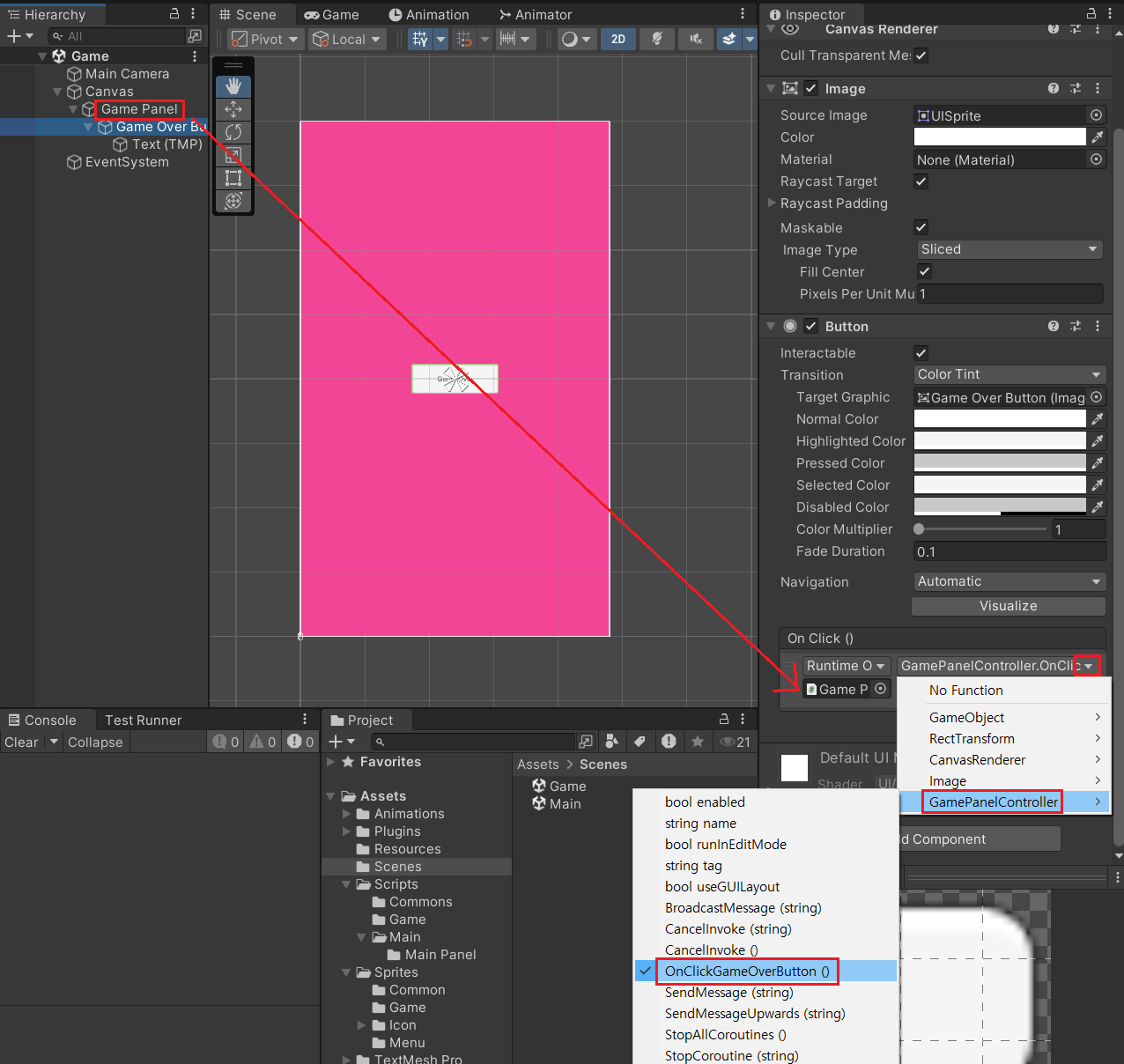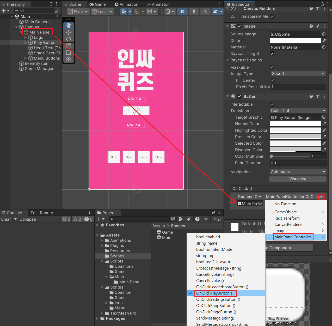 >> Main Panel에 Main Panel Controller.cs 추가 및 바인딩
