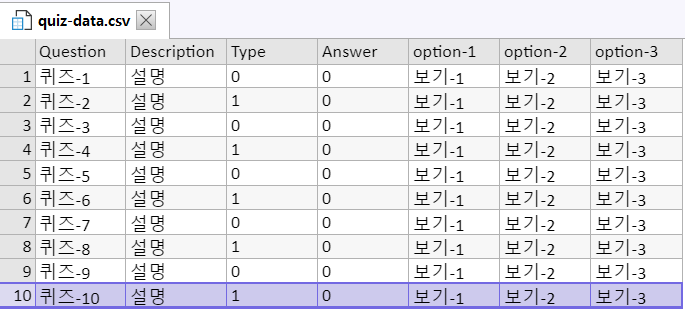 - 퀴즈 정보는 Quiz file(.csv)이 가지고 있다.