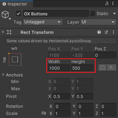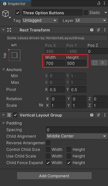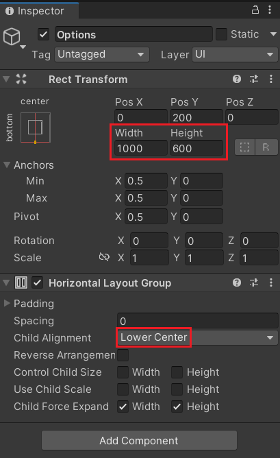 4. Options의 Width와 Height 조정 및 Horizontal Layout Group의 Chile Alignment 변경