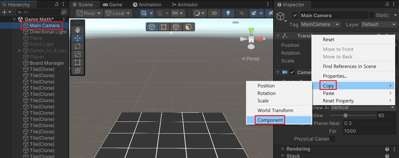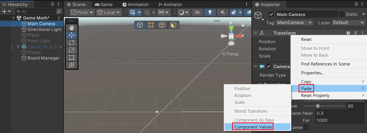 3. Play를 종료한 뒤, MainCamera의 Transform에 값 붙여넣기
