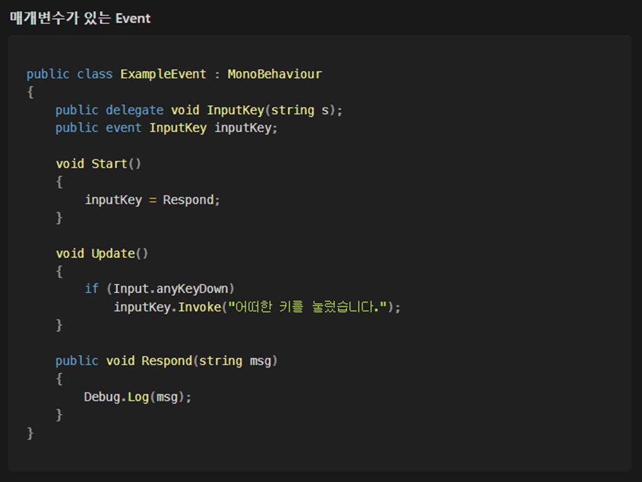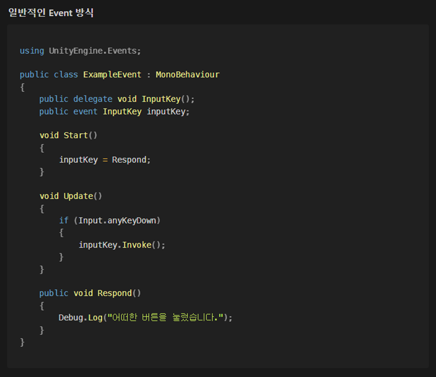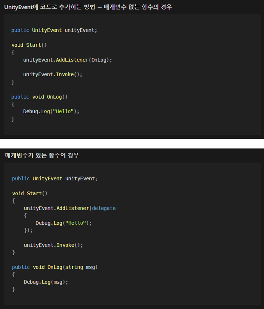 - UnityEvent 삭제 - RemoveListener(함수명); --> 전체 삭제 : RemoveAllListener();