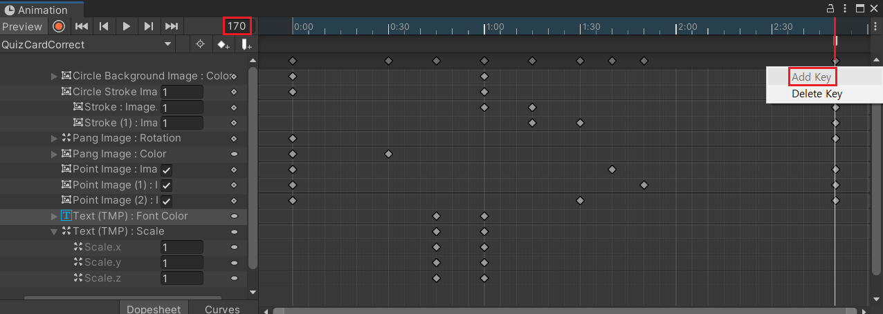 ※ Animation의 지속 시간을 늘리기 위해 170프레임에서 'Add Key' 해주기