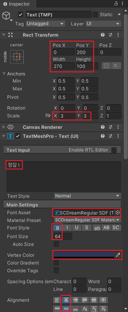 - Text : [45 ~ 60프레임] Color의 Alpha 값을 0 ~ 1로 변경, Scale.x와 Scale.y를 3 ~ 1로 변경