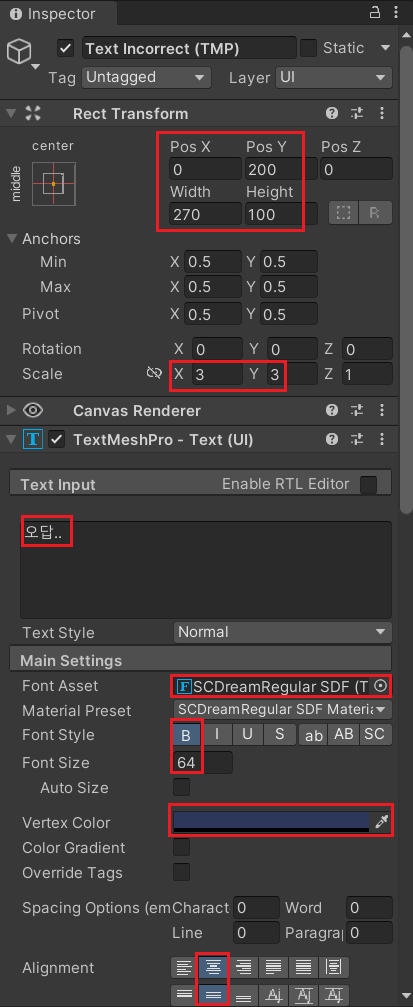 - Text Incorrect : [45 ~ 60프레임] Color의 Alpha 값을 0 ~ 1로 변경, Scale.x와 Scale.y를 3 ~ 1로 변경