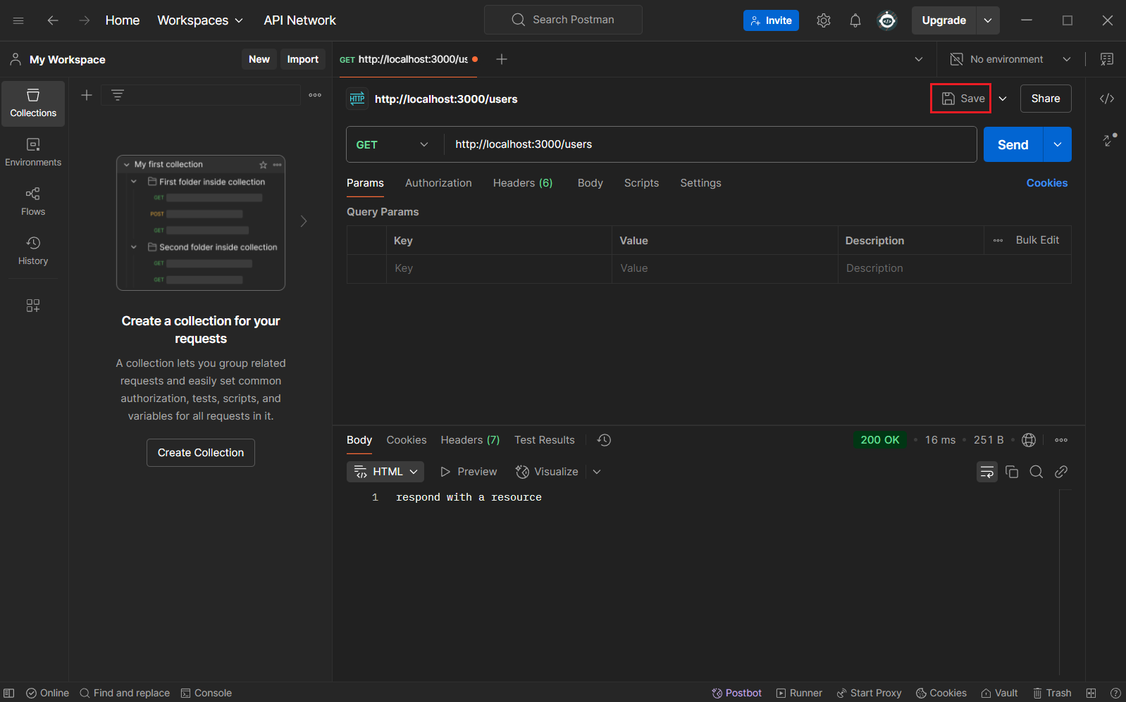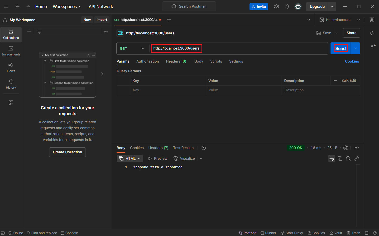 --> 아래에 respond with a resource가 나오면 성공 (routes/users.js 파일에 있는대로 나온 것)