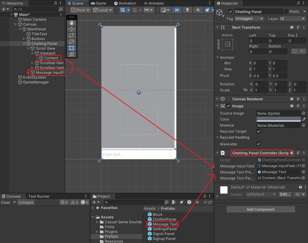 >> Chatting Panel에 ChattingPanelController.cs 추가 및 바인딩