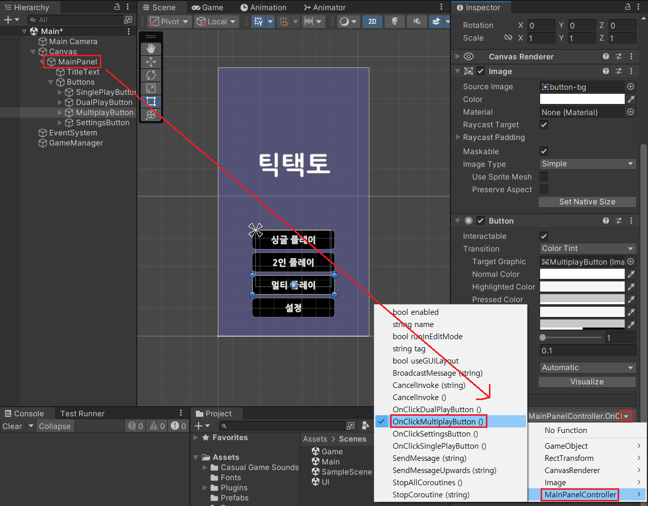 : Text도 '멀티 플레이'로 변경, OnClick()에 함수 바인딩