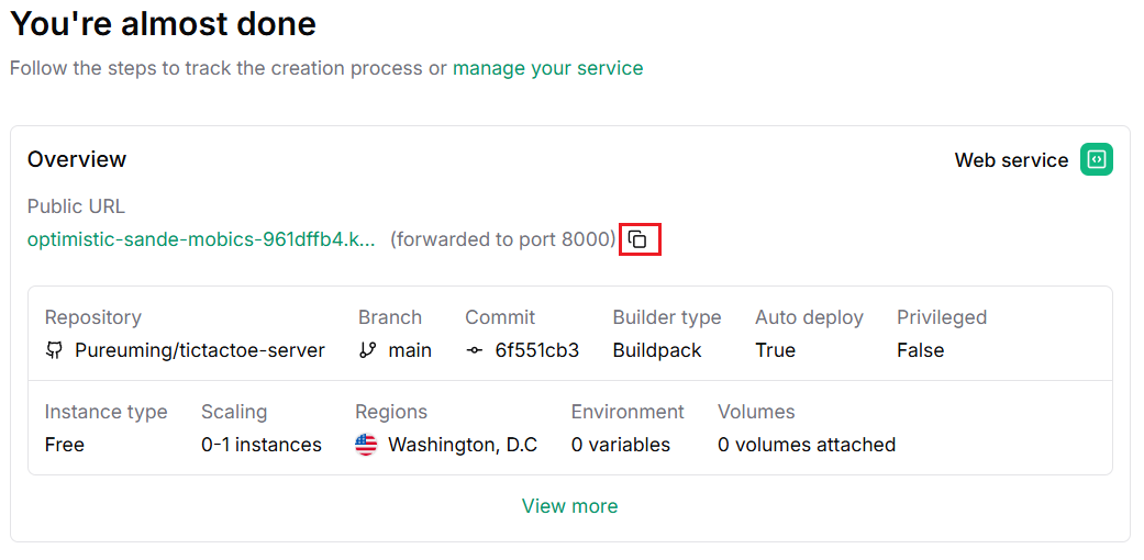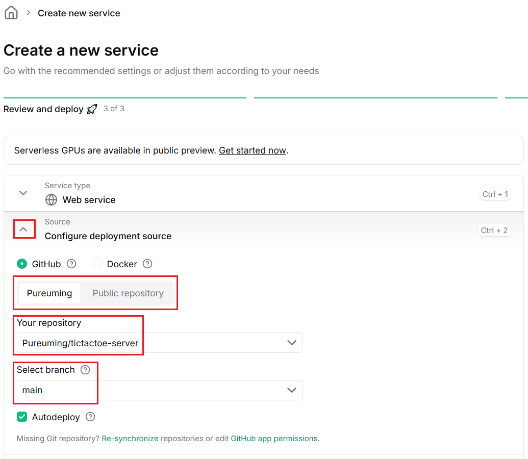 --> 마찬가지로 public repository라면 URL로, 아니라면 연결한 것 선택, 이후 Deploy 클릭