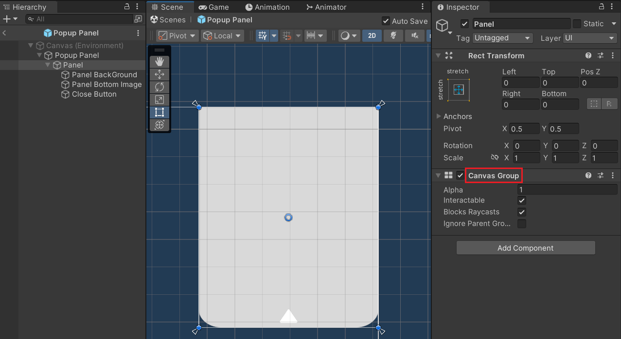 >> 'Panel'의 자식으로 'Panel BackGround', 'Panel Bottom Image', 'Close Button' 생성