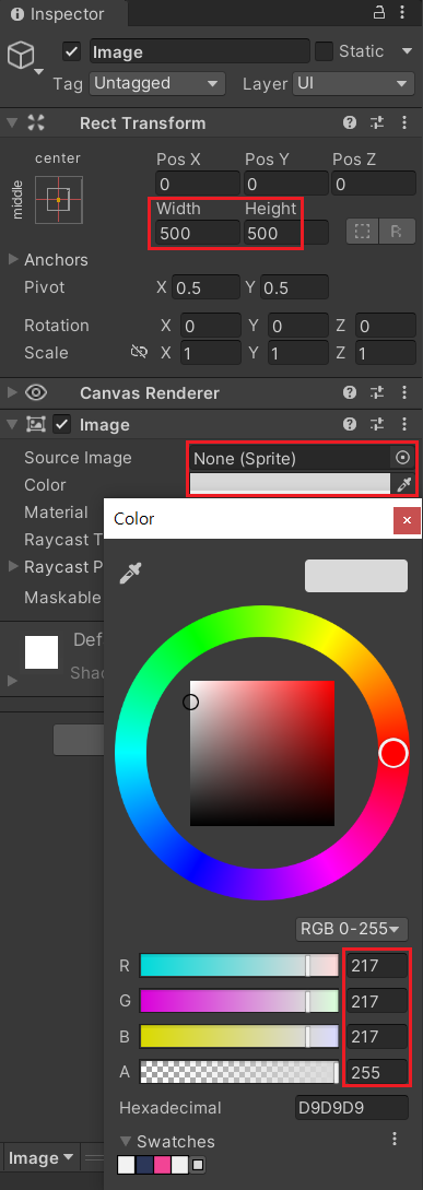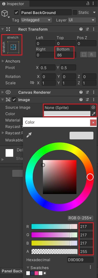 : UI-Image로 생성, Color는 (217, 217, 217, 255) --> Hexadecimal : 'D9D9D9'