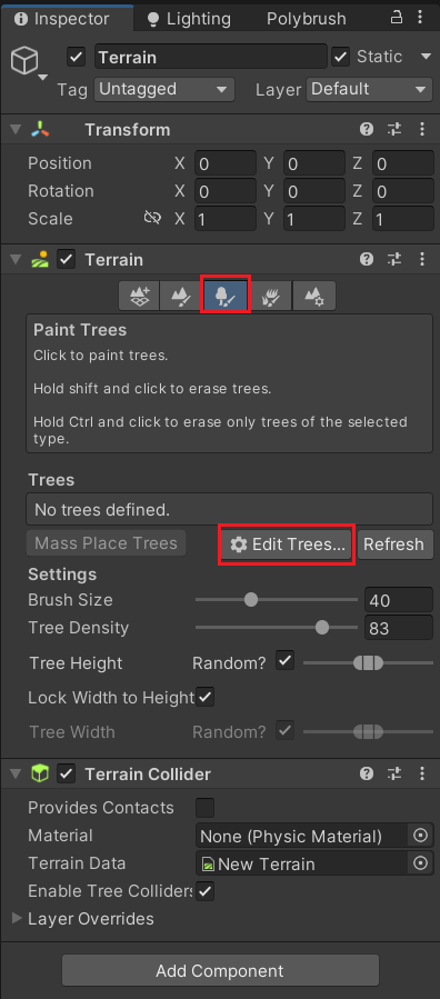 : Add Tree를 눌러 나무를 추가할 수 있다.