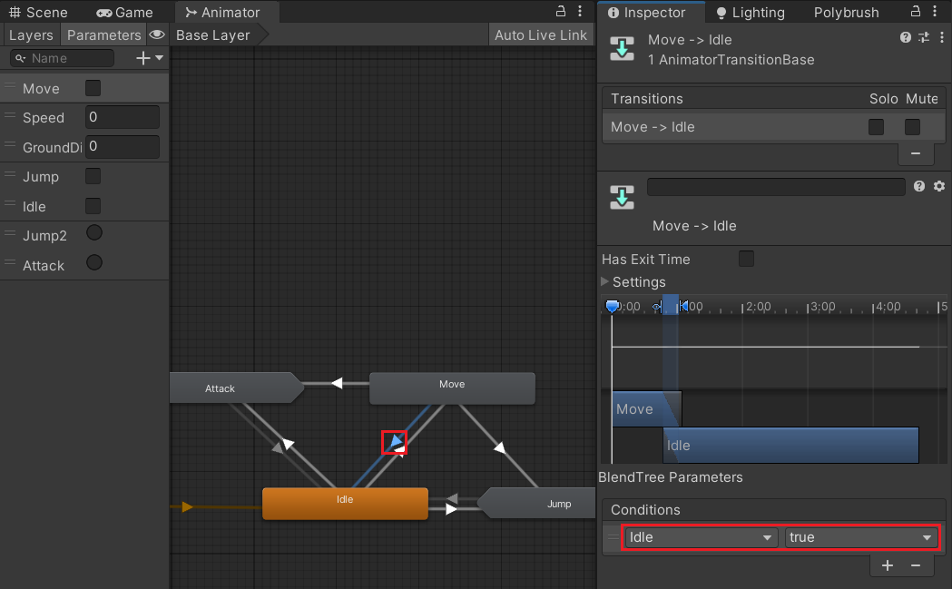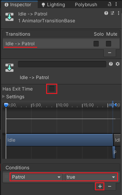 : Bool 타입으로 'Idle', 'Patrol', 'Trace' 추가 --> Idle, Patrol, Trace 간의 Transition만 우선 설정