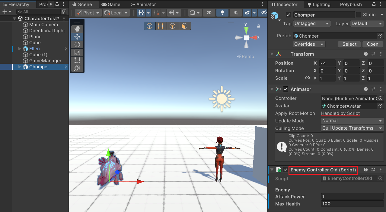 --> EnemyControllerOld.cs에서 OnAnimatorMove()로 관리하기 때문에 Apply Root Motion이 Handled by Script로 바뀐 모습